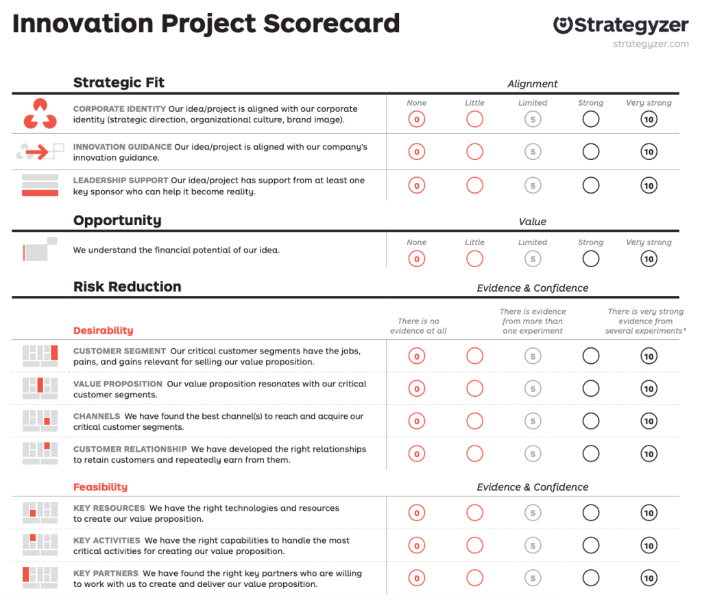 Apparently unrelated to the above collection of innovation metrics, Strategyzer also introduce their Project Scorecard, which they position as a tool to both inform project selection and evaluate project progress.